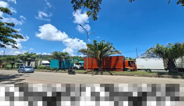 Di bawah terik matahari siang, para sopir angkutan barang dengan sabar menanti untuk masuk ke area pelabuhan. Cuaca yang panas menjadi tantangan tersendiri bagi mereka, yang harus bersikap tenang meski terjebak dalam antrean panjang yang tampaknya tak kunjung berakhir.